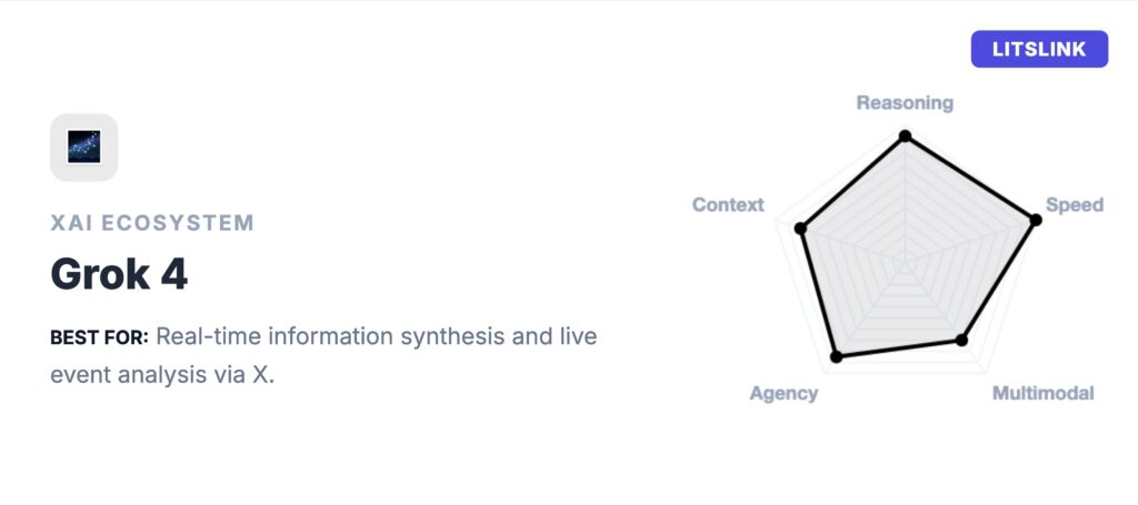 For analysts, product teams tracking competitors, or anyone whose research depends on what’s happening right now rather than what happened last quarter, that’s a genuine structural advantage. On the Artificial Analysis Intelligence Index, Grok 4 scores 42 against a median of 27 for comparable models – placing it well above average in the strongest AI tier for reasoning tasks.