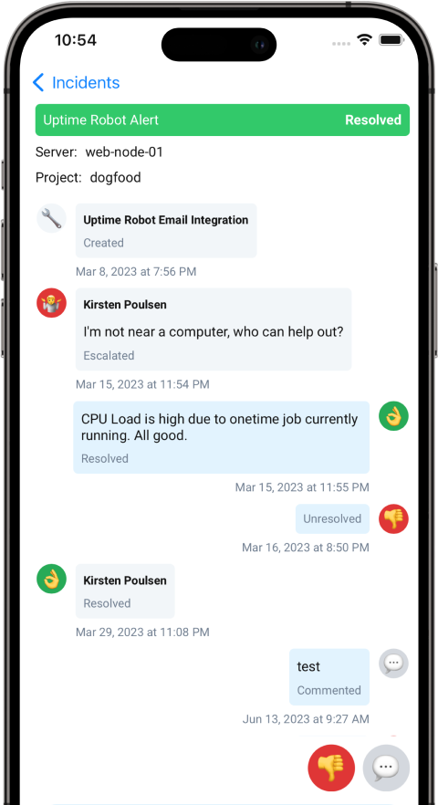 - Actionable push notifications. All incidents now have buttons to resolve, unresolve, comment, and escalate to higher groups, even on the lock screen.