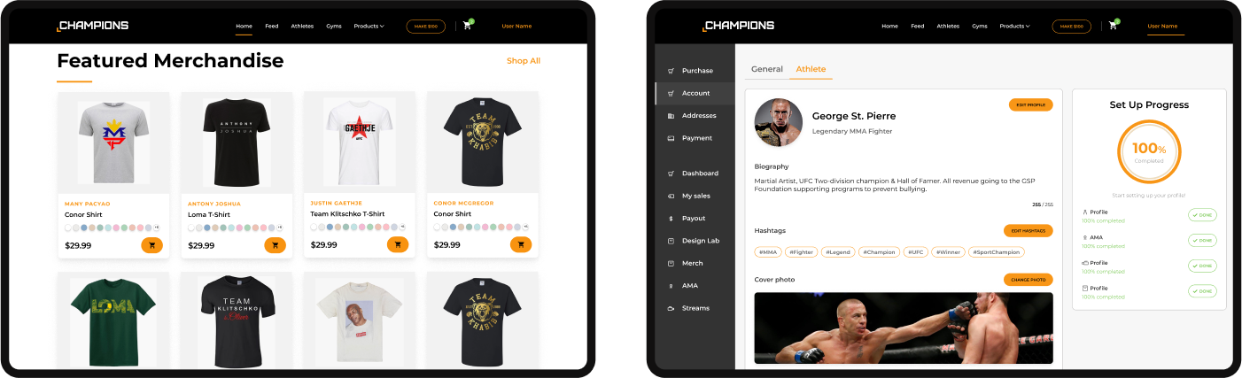 Champions successfully simplified merch production for middle-segment sportsmen. As a result, athletes can use the platform to connect with their fans and promote their merch among mass audiences.