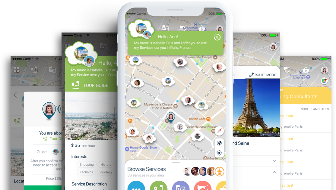 - The mobile app shows travelers all available service providers on the map based on geolocation. Users are free to choose anyone with whom to chat with